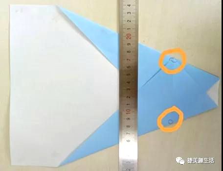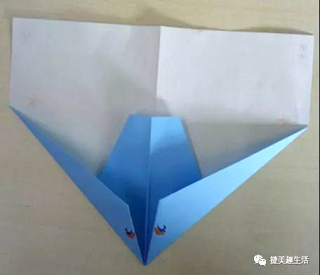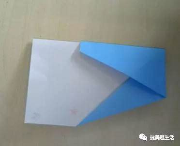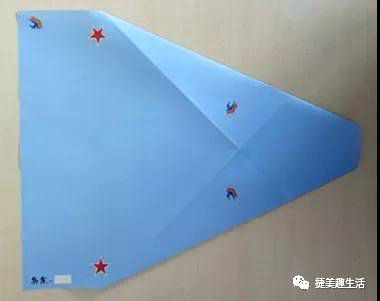 12、先折起一邊,后面的恰好蓋住飛機尾部就行,另一邊按照此方法再折起來就可以將飛機展開了,折機翼時機翼的邊緣與另一邊的角剛好到邊,如下圖: