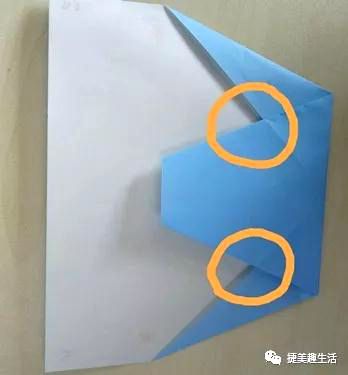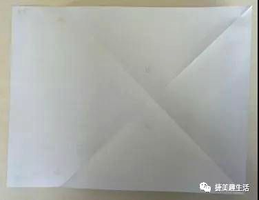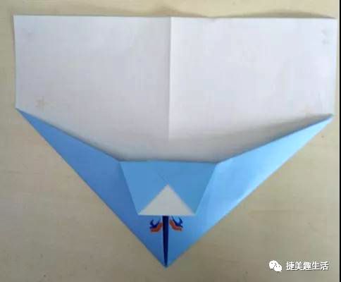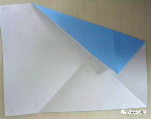 7、將頂部向下折,折點就是上一步展示的那個交叉點,折疊好后折痕和下面的紙邊正好重疊