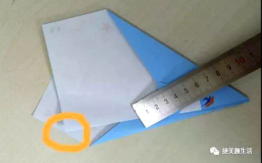 5、 另一邊按照同樣的方式進(jìn)行折疊,折疊準(zhǔn)確,按圖中畫圈的角恰好在折線上(尺子為壓一下,請忽略尺子作用)